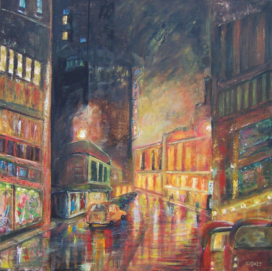 » MIASTO NOCĄ 99×99 cm, akryl-olej na płótnie
